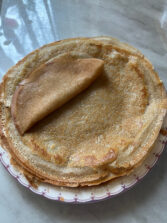 Смешать муку,соль,сахар,соду. Постепенно, тщательно размешивая, чтобы не было комков, влить воду. Долить в тесто крутой кипяток, сразу после закипания воды, размешать. Добавить растительное масло, перемешать и оставить на 15 минут. Сковороду смазать маслом только перед первым блином. Получится примерно 10 штук. Начинка может быть любая, например, тушеная капуста.