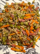Булгур в пакетиках поставить вариться. Лук мелко нарезать, морковь тонкой соломкой. Колбасные изделия соломкой или кружочками. Обжарить в смеси сливочного и растительного масла сначала лук, потом добавить к нему морковь. Когда морковь станет мягкой, там же обжарить колбасу или сосиски. Готовый булгур высыпать к ним на сковороду, перемешать. Туда же выложить зеленый горошек, еще раз перемешать, прогреть все вместе. Снять с огня и оставить под крышкой на 5 минут.