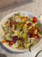 Баклажаны очистить, нарезать кубиками и положить в холодную подсоленную воду на 15 минут. Отжать и посыпать крахмалом, перемешать. Обжарить на хорошо разогретой сковороде в растительном масле до золотистой корочки. Выложить в салатницу готовые баклажаны, нарезанные помидоры и зелень. Сверху добавить шарик творожного сыра и полить соусом.